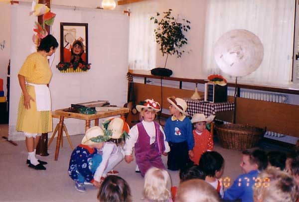 samozřejmě se zpívá o jídle, o vaření a o všem co k tomu patří. Pohádky, ve kterých se aktivně účastní i děti – Král zeleniny a O Koblížkovi.